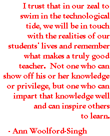 Before my attendance at the Epiphany Institute, I was uncertain, filled with conflict, about my using computers in my classes. I had always been technophobic, probably because of my upbringing. Every time something broke down at home, my mother, a strong, independent woman in numerous ways, instantly became helpless and called for my father, who didn't often appear to know what he was doing but was comfortable trying, free to swear, fiddle, and sometimes utterly ruin what he had set out to fix. Like mother, I watched and internalized the unfortunate notion that as woman I had many strengths but fixing mechanical things was not one of them. In fact, it was downright unnatural and unnecessary for me to have any working knowledge of machinery except how to turn it on and off.