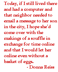 call, she came over with half a dozen freshly laid eggs and used our phone. She didn't have a car,