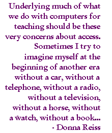 So we cannot provide everybody a computer, but maybe we can strive to provide access on our campuses and in our public libraries. We can lobby for putting quality equipment where students and the public can use it to find the information they need and to perform the tasks they need. We can think more in terms of establishing computer-supported learning environments we can share instead of departmental facilities that are idle when there's not an autocad class in session even though the math teachers are clamoring for a place to take a class for mathcad.