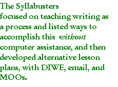For many participants, one of the most valuable parts of the workshop was observing mainstream faculty interacting with new technologies in an intensive, focused environment for a full week. Observing highly experienced teachers learning about email, hypertext and the Internet, online discussion, networked file-sharing, and collaborative electronic pedagogies gave us insight into the needs other faculty may have as they either encounter computers for the first time or attempt to use them more fully with their teaching and scholarly practices. Each workshop gave constant reminders that computer-and-composition workshops are still faculty development workshops and that technology-trainers should keep magical thinking about computers to a minimum by concentrating on teaching first, technology second . All of this is reminiscent of the early adopter-to-mainstream continuum that Steve Gilbert wrote about in the oft-cited March/April 1996 issue of Change Magazine , published by the American Association of Higher Education. Gilbert is a co-principal investigator for the Epiphany Project; his Teaching, Learning and Technology (TLT) Roundtables are a sister project.
