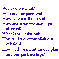 Finding that answers to each of these may imply changes to previous answers and thus prompt recursiveness, the group designed a planning "wheel" to aid in building effective partnerships.