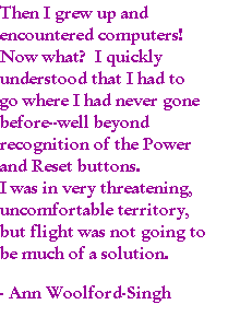 Before my attendance at the Epiphany Institute, I was uncertain, filled with conflict, about my using computers in my classes. I had always been technophobic, probably because of my upbringing. Every time something broke down at home, my mother, a strong, independent woman in numerous ways, instantly became helpless and called for my father, who didn't often appear to know what he was doing but was comfortable trying, free to swear, fiddle, and sometimes utterly ruin what he had set out to fix. Like mother, I watched and internalized the unfortunate notion that as woman I had many strengths but fixing mechanical things was not one of them. In fact, it was downright unnatural and unnecessary for me to have any working knowledge of machinery except how to turn it on and off.