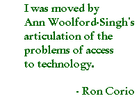 I continue to have reservations, political and personal, about who is getting swept up, and left behind, in our work. Michael Keller and I want to write about access--who gets it, who doesn't, what we buy into ideologically when we make assumptions about students and "the public." As Ann made clear at the end of the Institute, we cannot ignore this issue. America is, always has been, a nation of haves and have nots. Before we add another level to exisiting divisions, anyone who remotely considers her/himself progressive politically should take stock of our assumptions about students' access to networked computing. Moreover, we should consider how we can expand access on our campuses and in our communities. Certainly, this issue is germane when we try to leverage campus and departmental change. - Joe Essid