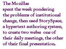 At the Richmond Institute, the forty participants broke out into teams to prepare a series of group presentations for the end of the week. The teams worked either on redesigning a traditional syllabus for use in technology-rich environments or on strategies for introducing institutional change. The Richmond leaders have posted photographs of these groups at the Institute web site.