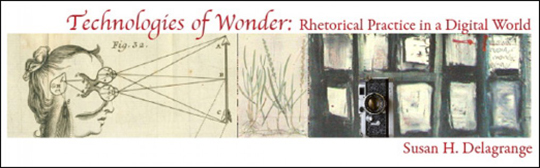 Susan H. Delagrange’s Technologies of Wonder: Rhetorical Practice in a Digital World is an intellectually stimulating exploration and a visually thrilling exemplar of the opportunities for persuasion, scholarship, and pedagogy that digital media offers to academics, teachers, and students. In the format of an innovative—and entirely free—ebook (published in Adobe PDF by Utah State University Press/Computers and Composition Digital Press), Delagrange uses the project to argue simultaneously for a revised perspective on digital composition centered on the canon of arrangement and embodied visual rhetoric and to exemplify what this might look like.