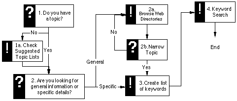 A Web Search Process: One way to research a topic on the Web. The tools you employ may vary. This diagram is an image map; to hear more about a particular step in the process, click on the appropriate box or word in the diagram.