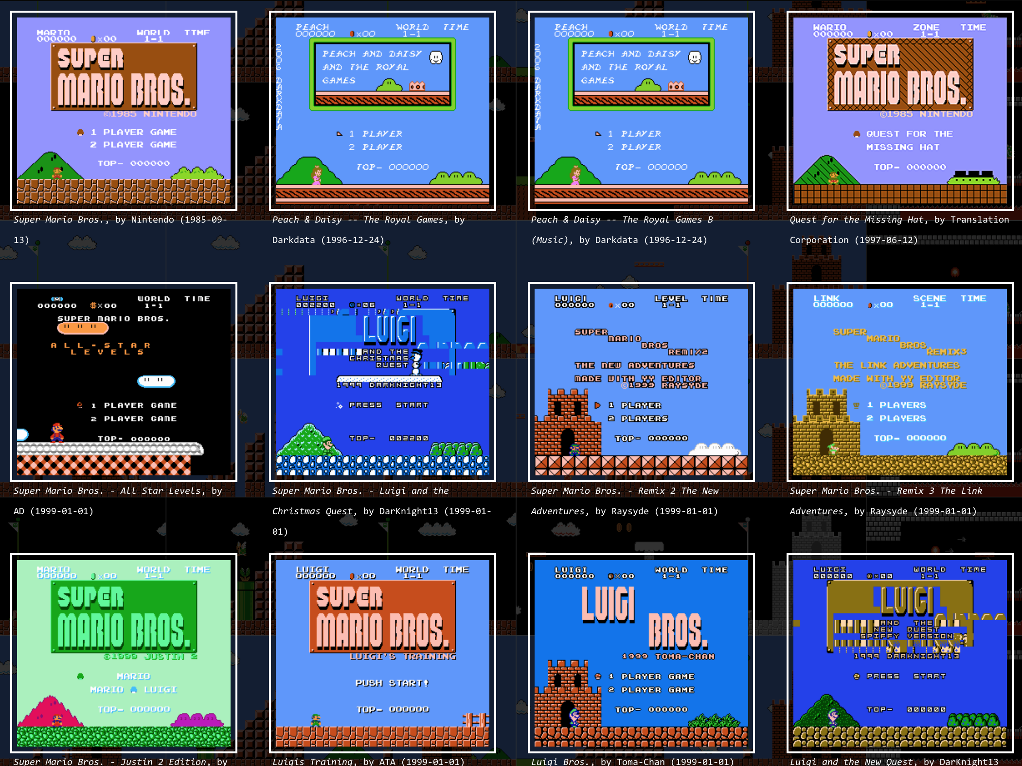 This page allows users to filter and sort the title screens of 240 Super Mario Bros. mods, all taken from ROMhacking.net's database. Sorting and filtering can be done by year, by modder, and by mod name, as well as through a quick search via text input. This tool can be useful for comparing the interfaces of mods by the same modder, from the same year, or in cases where a connection or correlation between mods or modders has been identified with the help of social network graphs or code comparisons. In addition, the title screens themselves contain a good deal of metadata, including names, dates, instructions to the user, or references to software and to community formations.